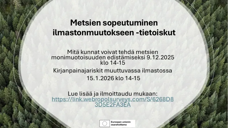 Tervetuloa kaikille avoimiin tietoiskuihin, joissa käsittelemme, miten kunnat voivat edistää metsiensä sopeutumista muuttuvaan ilmastoon.